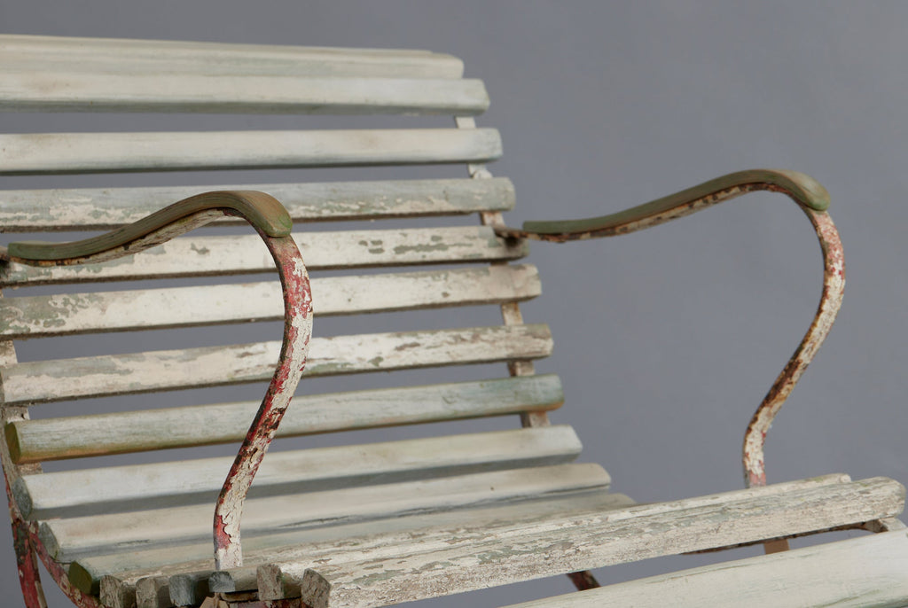Iron and Wood Scroll Arm French Teak and Wood Garden Chair in Old White