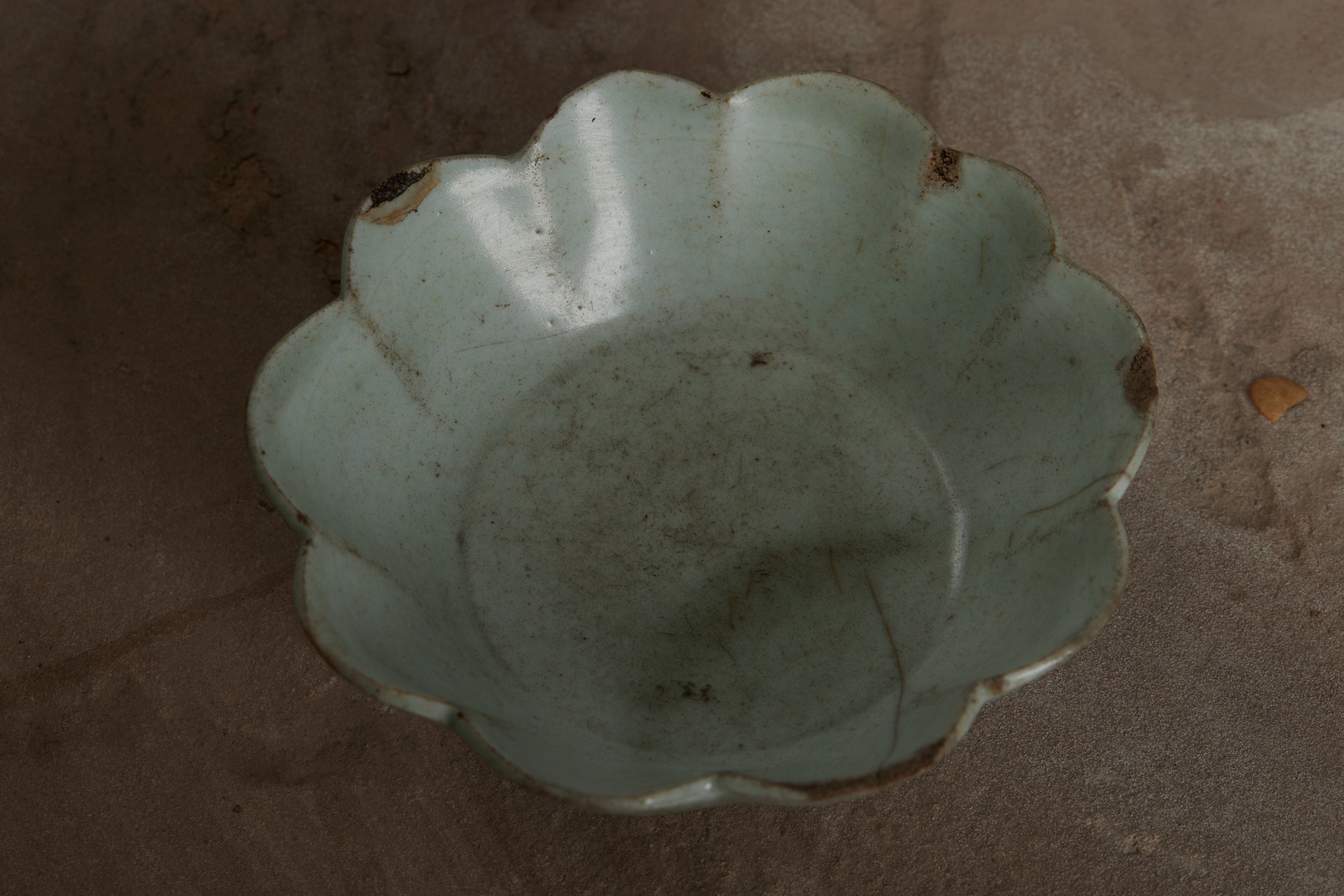 Yue Yuan Dynasty Small White Lotus Shaped Bowl with a Pale Celadon Glaze
