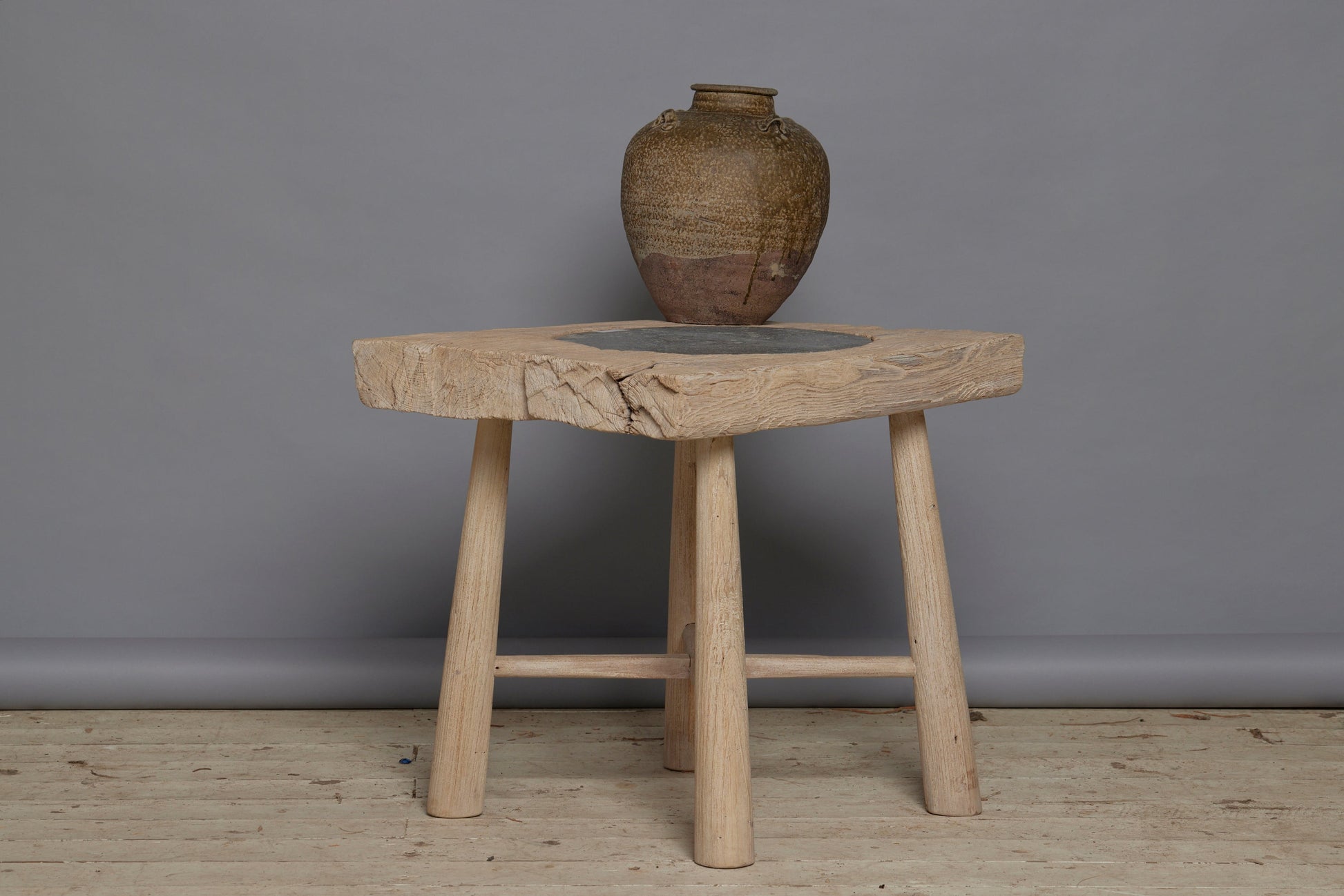 Tapered Leg Bleached Teak Side Table with a Round 18th Century Cut Belgian Blue Stone Insert