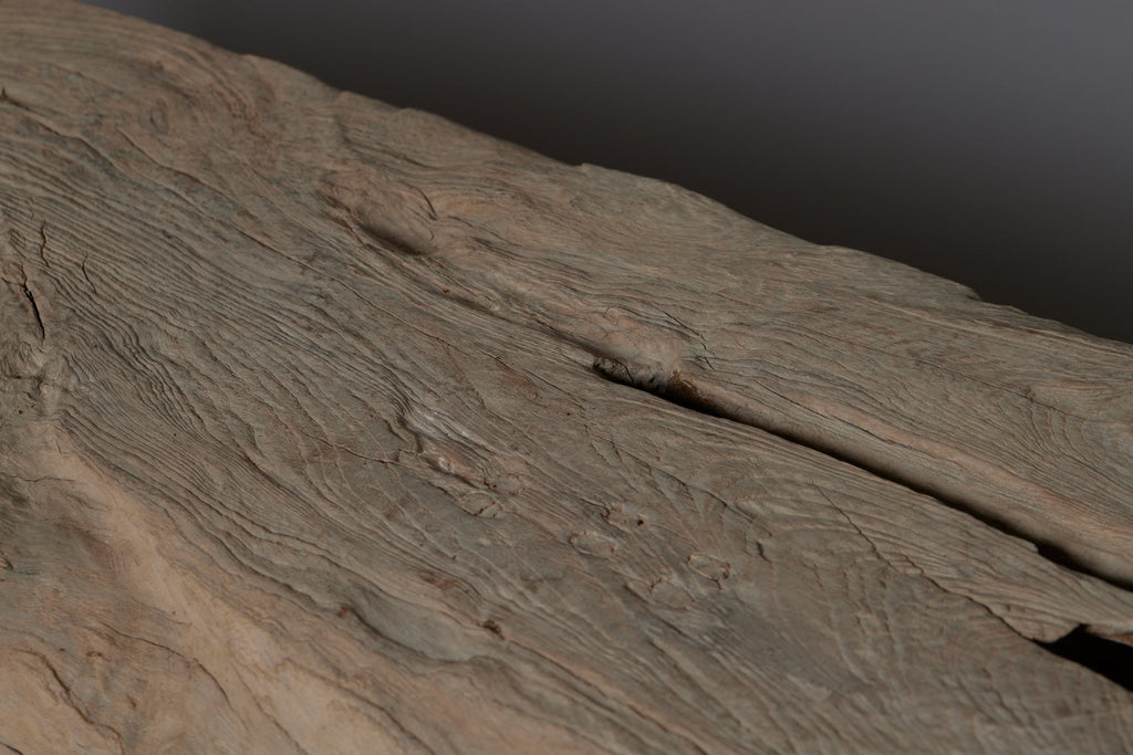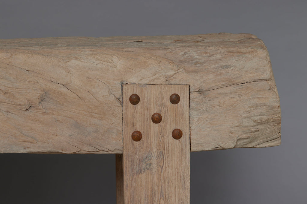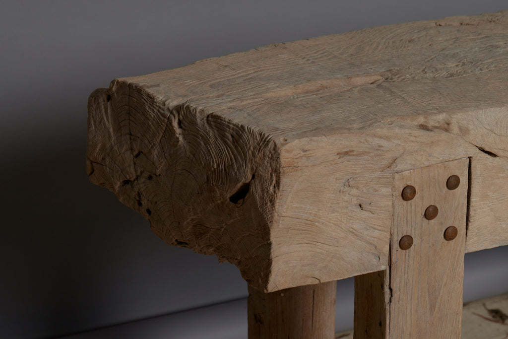 A Thick Top Weathered Teak Console Table with Square Cut Legs and a Stretcher Base