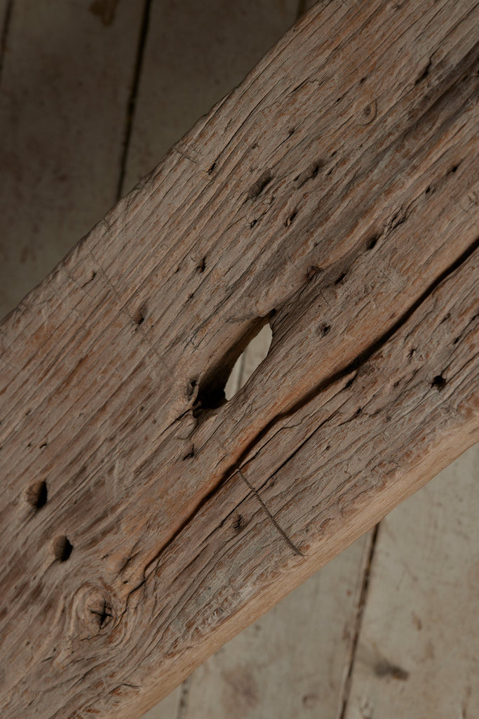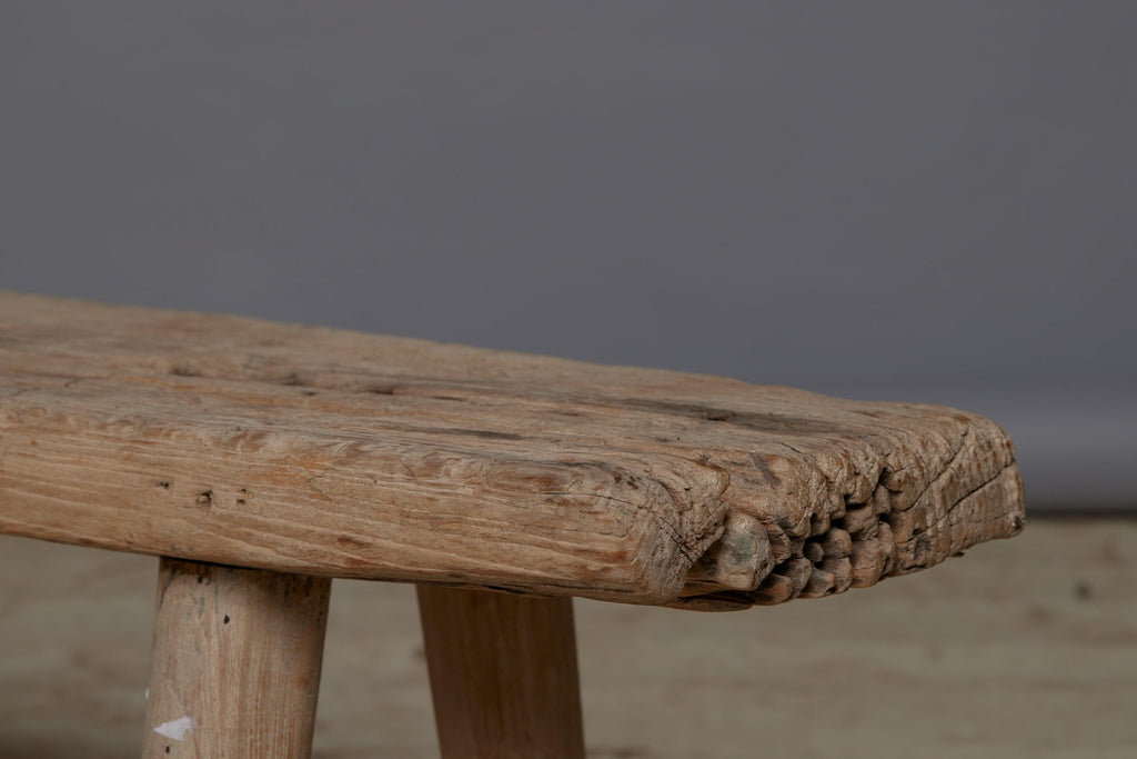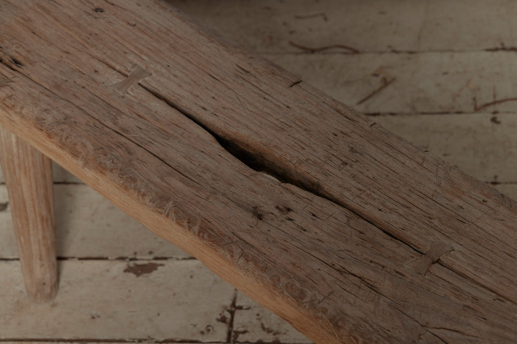 Thick Top White Washed Old Teak Bench with Round Tapered Splayed Legs and a Soft Old Weathered Patina