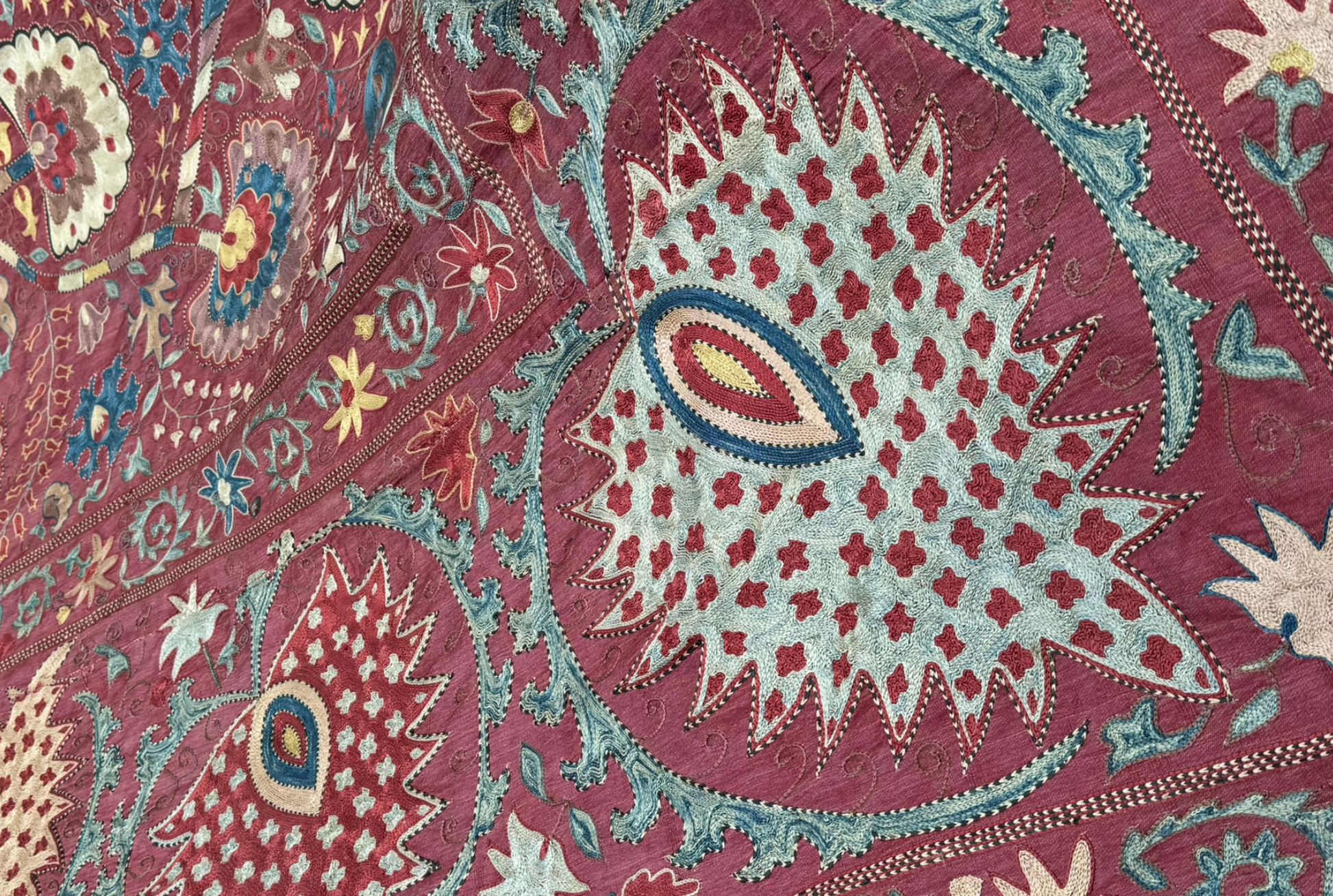 Vervain Red Uzbek Suzani with Hand Embroidered Floral Motif in Queen Size