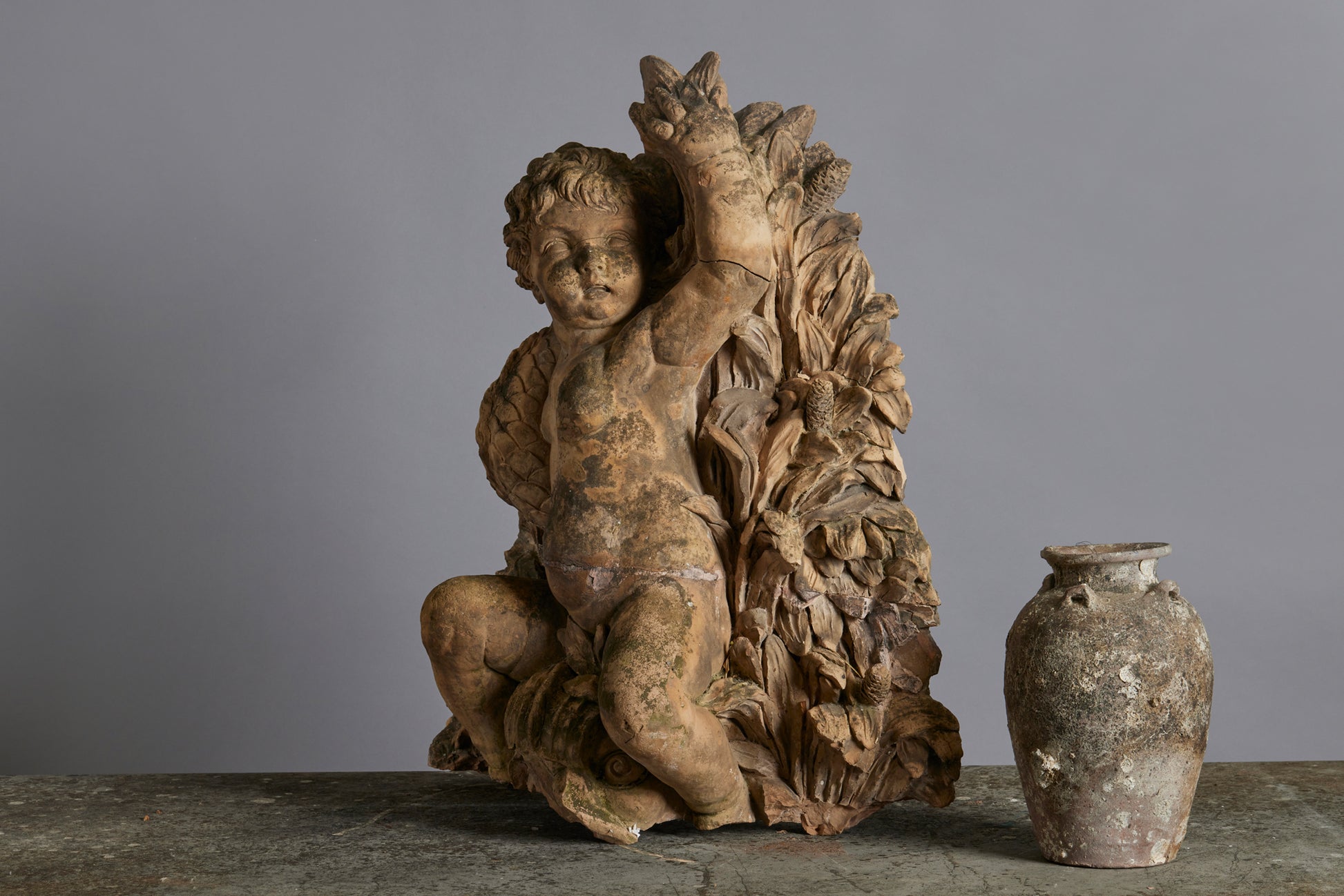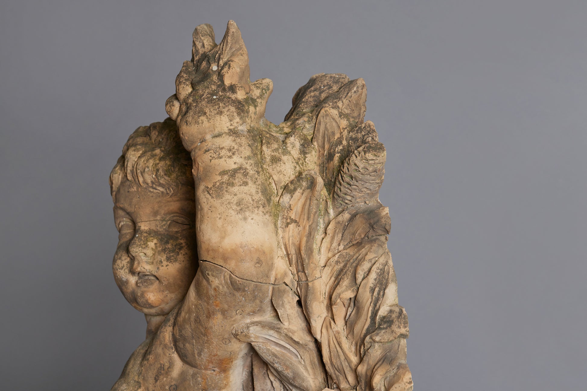 Mid to Late 18th Century Terra Cotta Fountainhead of a Putto Riding a Dolphin